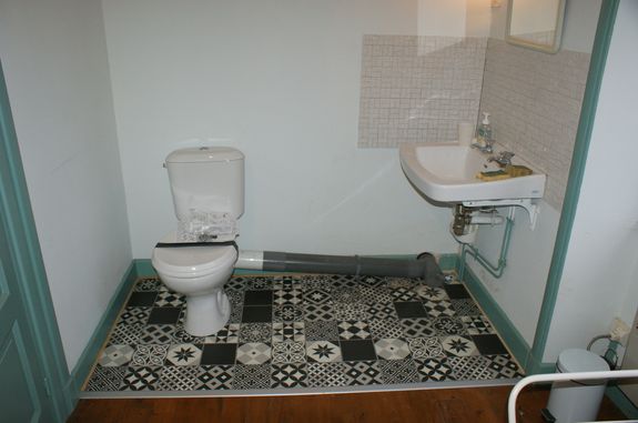 Le sol en dalles de PVC a été posé. La cuvette a été positionnée et raccordée à son évacuation. Rien n'est collé ni fixé et l'alimentation en eau n'est pas faite. Bien entendu il ne faut pas l'utiliser.