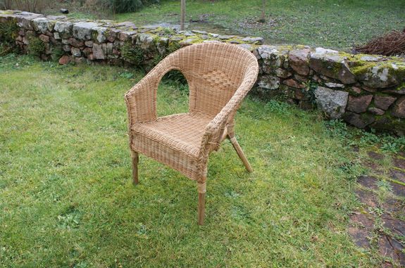 Un fauteuil en rotin de récupération est entreposé dans la grange.