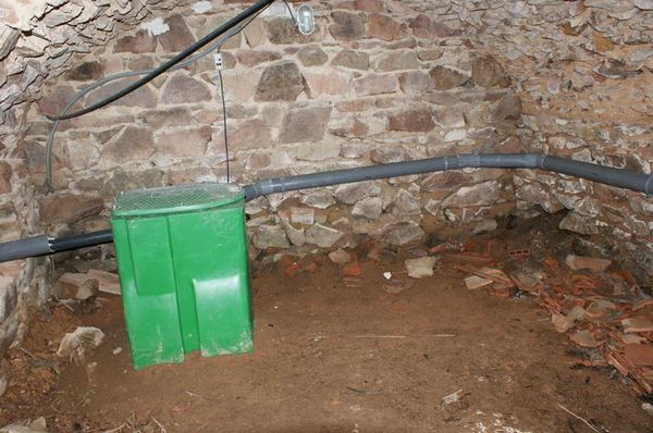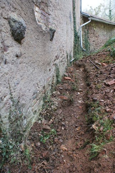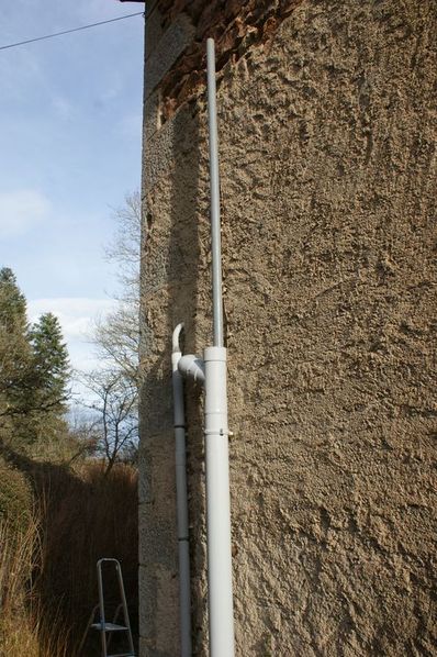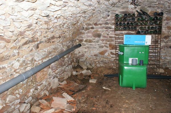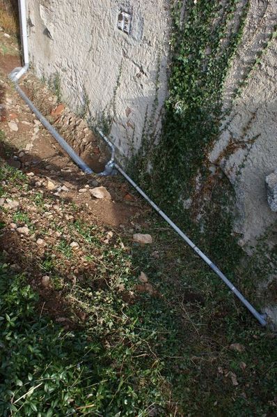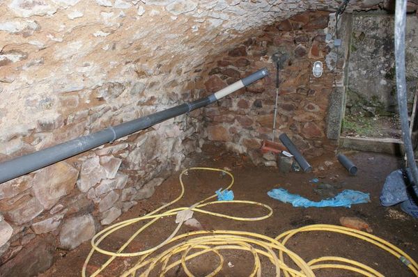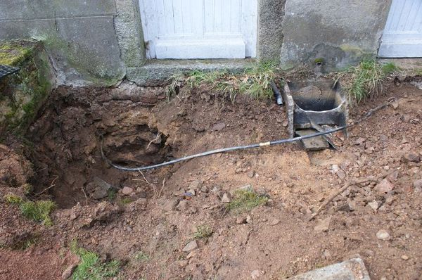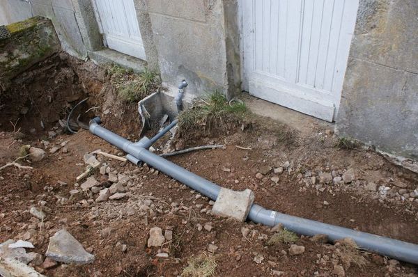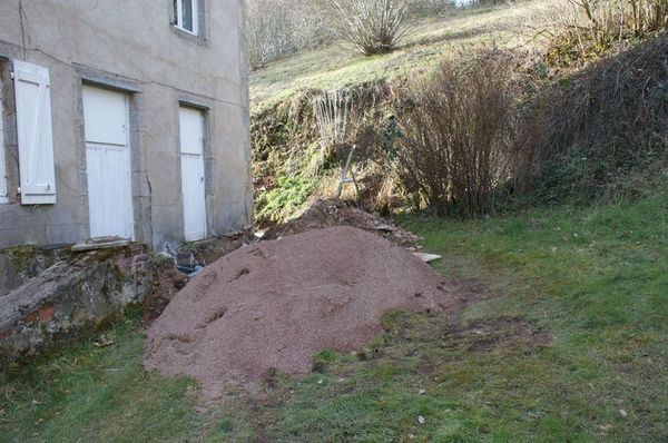 | La pompe a été reliée aux différents points de collecte d'abord en traversant les deux caves puis le mur Est La pompe destinée à la vieille maison est entreposée dans la cave Ouest. La sortie de la baignoire, du lavabo, des toilettes du premier étage, de la machine à laver, du chauffe-eau et de la cuisine ont été raccordées. La connexion des toilettes du rez-de-chaussée n'est pas réalisée. Le remblayage reste à réaliser avec du sable pour protéger les tuyaux puis du tout-venant entreposé à proximité.