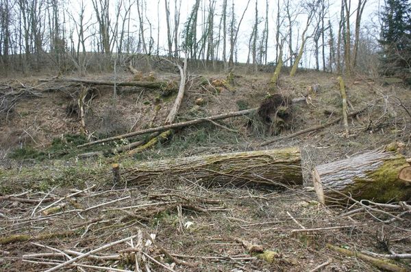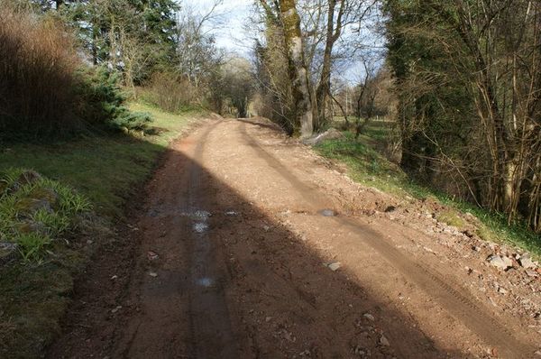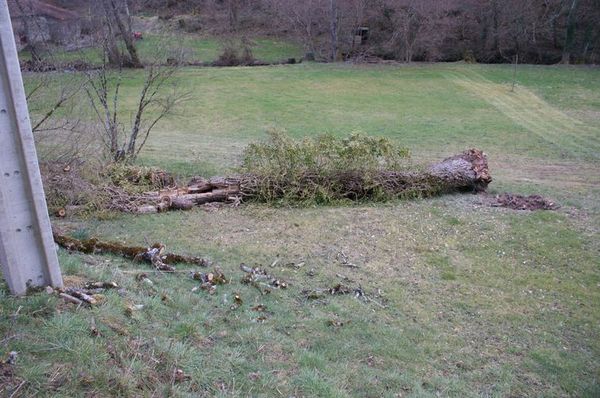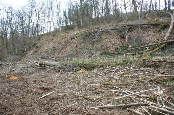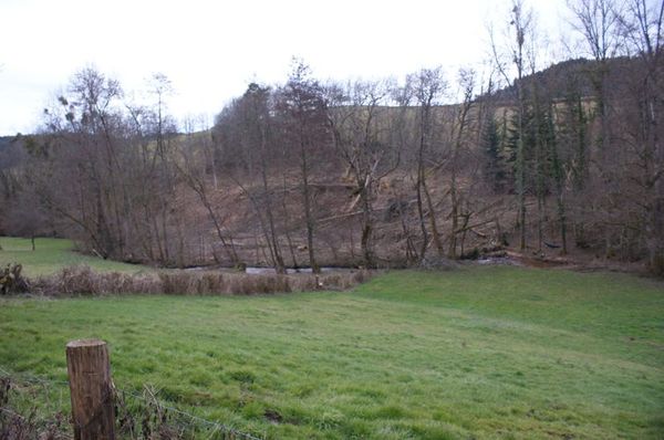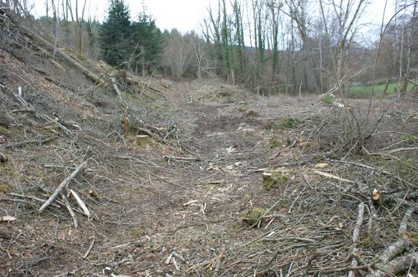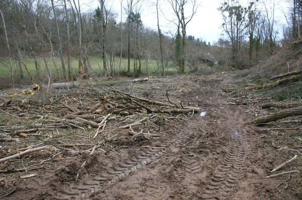 | Le chantier de nettoyage de la partie Ouest de la propriété a bien progressé. La majorité est exploitée pour le bois de chauffage. Un peuplier, quelques robiniers et un douglas seront exploités en bois d'œuvre. Les quelques sapins plantés à la fin des années soixante et les arbres en bordure de rivière ou de parcelle ont été sauvegardés. Pour la sortie du bois le gué a été réactivé. Les branchages seront rassemblés en andains sous la falaise (ancienne carrière). |