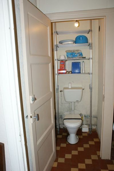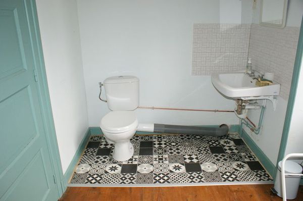 | Les toilettes de l'étage ont été connectées à l'évacuation et un piquage a permis d'alimenter la chasse d'eau. Tout cet ensemble est fonctionnel. Ce sont les seuls WC dans la grande maison. Les WC du rez-de-chaussée vont être agrandis. |
