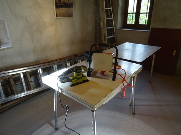 | Les poutres ont été décapées et traitée au xylophène. La peinture et la bâche de protection ont été acquises.