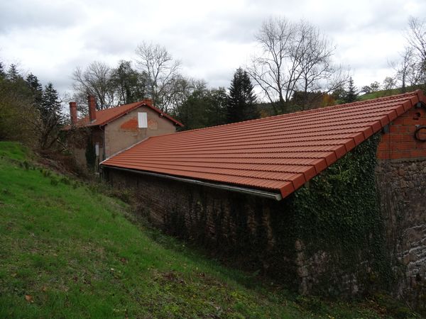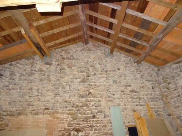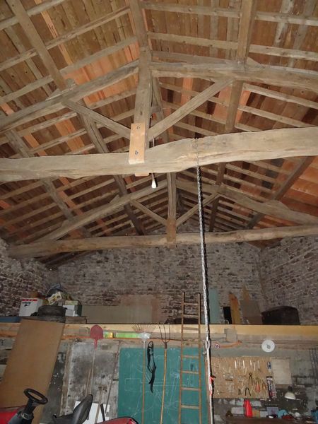 | La toiture de la grange est refaite à neuf. Une des panne, cassée, a été réparée. Les assises des trois autres sont à remaçonner. Les poinçons des deux fermes anciennes ont été réalignés avec les tirants. Les tuiles de secours sont stockées dans la petite remise derrière le garage vert.