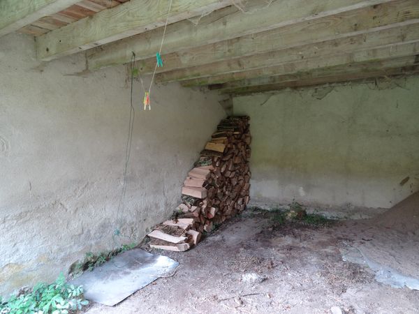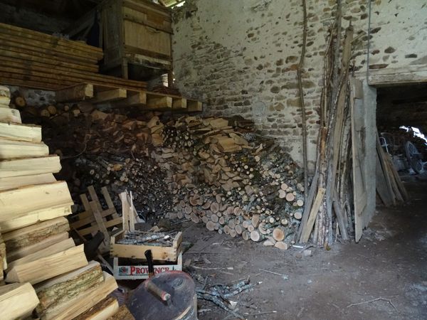 L'arbre abattu en août a été totalement débité et rentré. Il est stocké le long du mur Ouest de la première salle du moulin. L'excédent est dans le garage ouvert. |