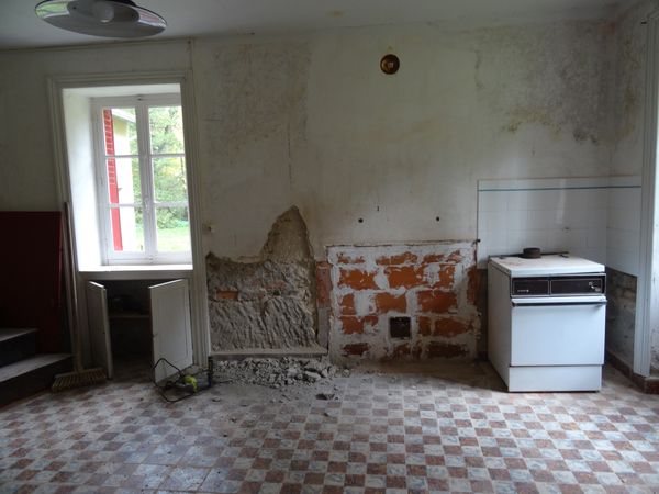 Le piquage du mur de la cuisine de la vieille maison a été commencé. Un maçon est venu pour faire un devis de réfection. |