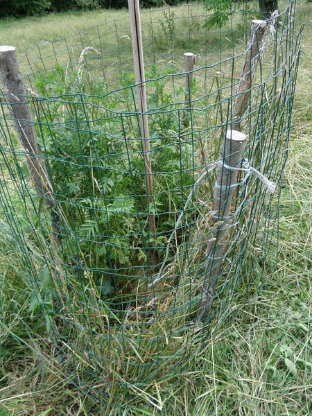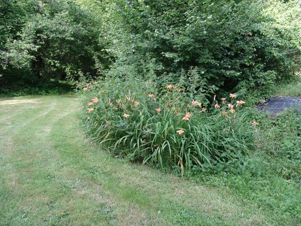 | Le printemps a été très humide et le début de l'été aussi. Avec la mise en sommeil du captage suite à des problèmes de filtres, la Teyssonne coule avec un débit rare à cette saison (celle des hémérocalles et des orties). En conséquence l'herbe ne manque pas mais elle a été couchée par la grêle et les pluies violentes. Les foins seront abondants mais de mauvaise qualité. Le petit pêcher sur le talus a été dégagé et repaillé avec de la sciure.