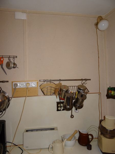 | L'ancien jeu de prises de la petite cuisine de grande maison a été changé. Une boîte de dérivation a permis de distribuer la terre sur toutes les prises. |