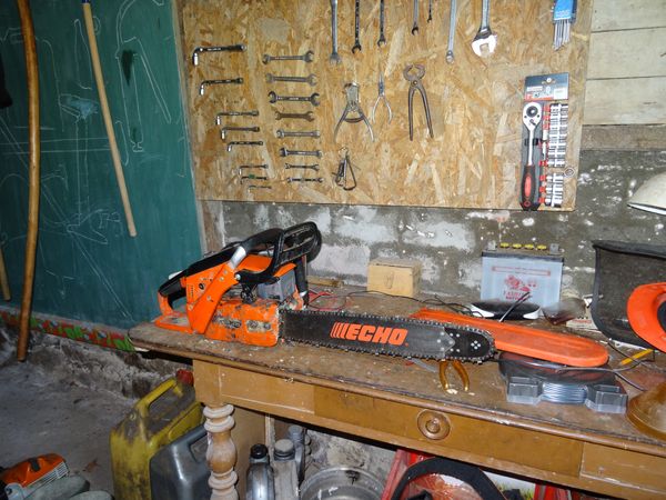 | Le guide de chaîne et la chaîne de la tronçonneuse ont été changés. Des serre-joints et un cordon de maçon ont été acquis