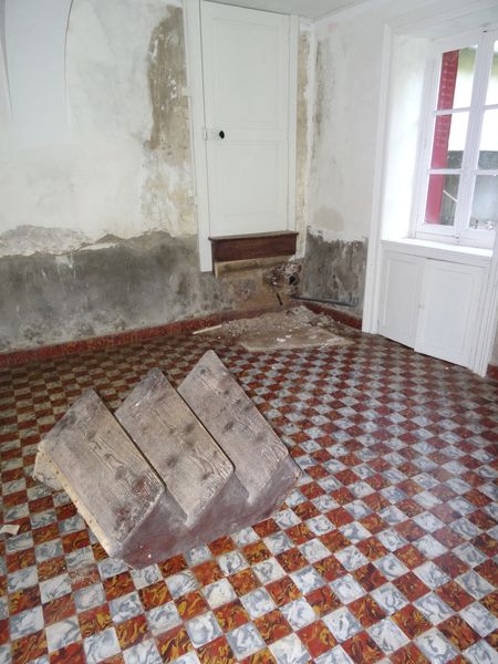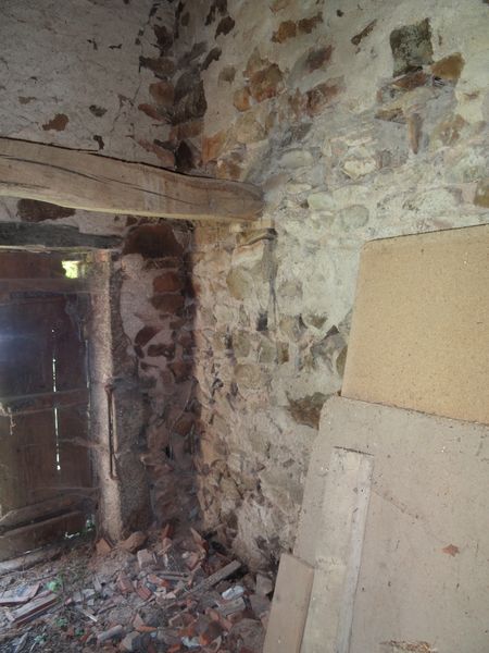 | Pour préparer l'intervention d'un maçon au mois de septembre les gravats derrière le pignon de la grange ont été débarrassés. De même l'escalier dans la grande cuisine de la vieille maison