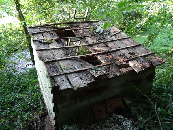 | Suite à un effondrement les tuiles de la cabane ont été stockées dans le moulin et les grosses branches de noisetier au-dessus de ce toit ont été supprimées.