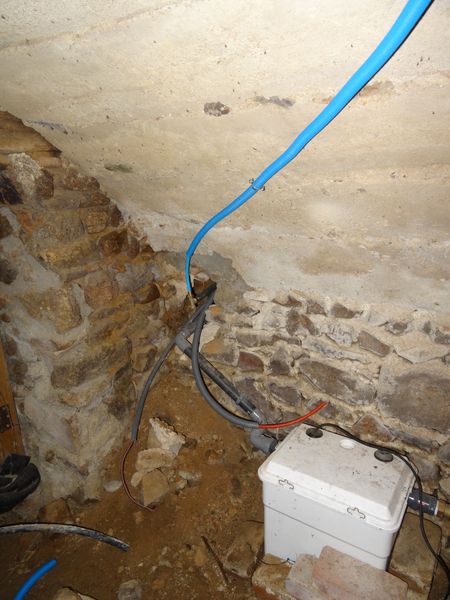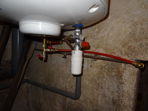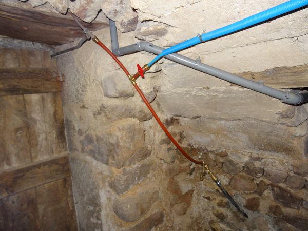 | Afin d'alimenter la future cuisine de la vieille maison en eaux chaudes et froides, L'installation réalisée en 1970 a été reprise dans la cave. Devant les problèmes de démontage, la totalité des composants a été changée. Le circuit d'eau froide est incomplet et le circuit d'eau chaude est juste amorcé sous le chauffe-eau. En conséquence il ne faut pas mettre en service l'installation dans la vieille maison car l'étanchéité n'a pas été testée.