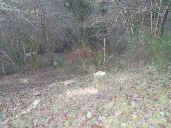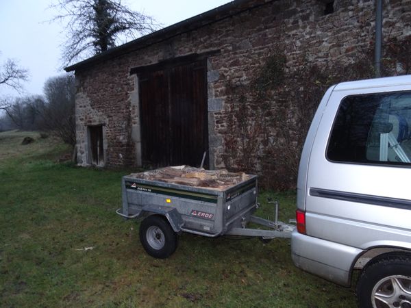 | Un jeune frêne mort près de l'entrée a été abattu, débité, rentré, fendu et rangé le long du mur Nord de la seconde salle du moulin. Une remorque de bois est partie pour Nantes.