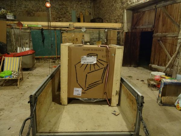 | Un poêle à bois a été amené de Nantes. Il attend des bras pour être installés dans la vieille maison.