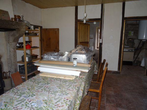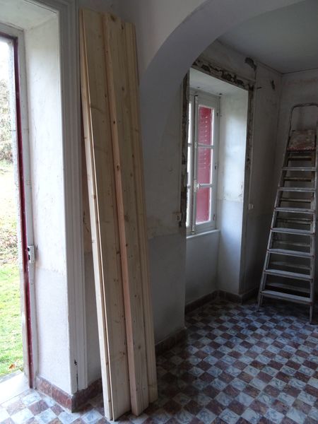 Des pièces de chambranle ont été confectionnées à Nantes et acheminées sur place. Des éléments de meuble de cuisine et un évier inox attendent la fin des travaux dans la grande cuisine de la vieille maison pour être montés. |