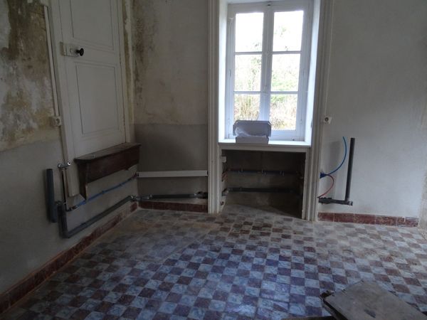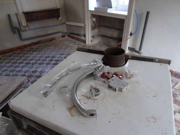 | L'ensemble de la plomberie évacuation, eau froide et eau chaude a été posée dans la cuisine de la vieille maison. La robinetterie et les robinets d'arrêt ont été approvisionnés.