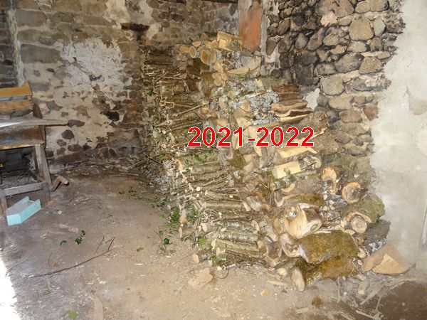 | Les Membré père et fils ont continué l'abattage des arbres du côteau. Pour l'instant le chemin du béal est inaccessible. Le noisetier à côté de la ruine de la rive droite, abîmé par la neige en 2018 a été recépé. Le bois est stocké le long du mur Nord de la deuxième salle du moulin. Le bois de chauffage à prendre en priorité se trouve au fond de la première remise.