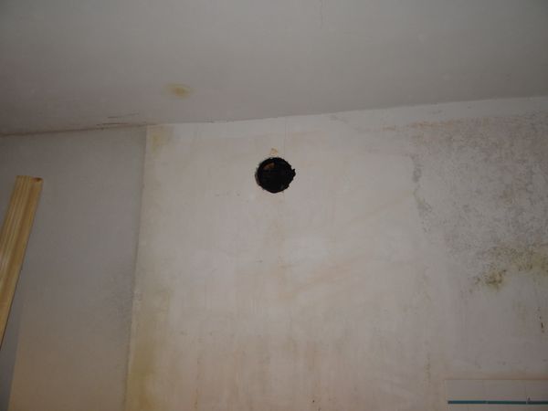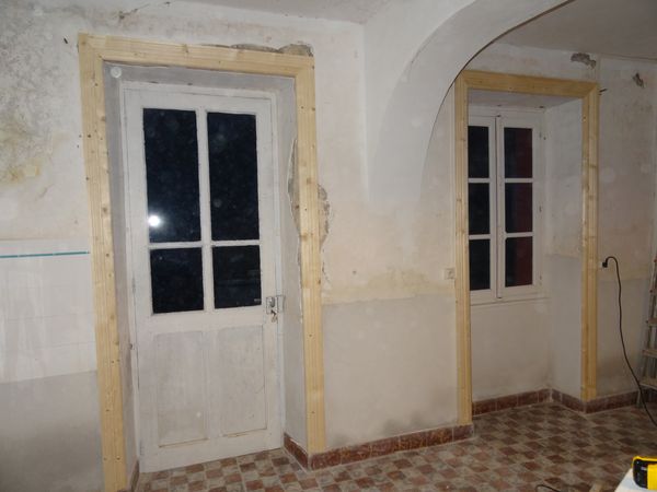 | Le trou du conduit a été agrandi pour sceller la manchette de 153. Les boiseries ont été fixées autour des ouvertures de la façade Sud de la cuisine. Celle de la porte l'est provisoirement. Des reprises de maçonnerie et de plâtre sont à prévoir car l'arrachage des anciennes boiseries, très dégradées, ne s'est pas bien passé.