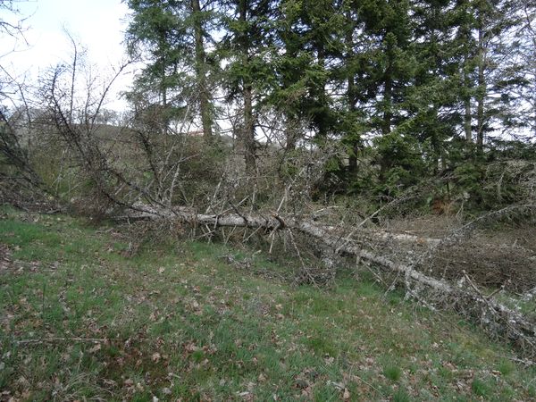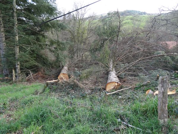| Les deux sapins morts le long de la rue du roc ont été abattus mais pas encore débités. L'exploitation du coteau a été continuée mais il reste du bois sur pied