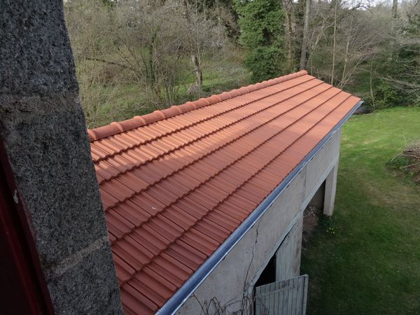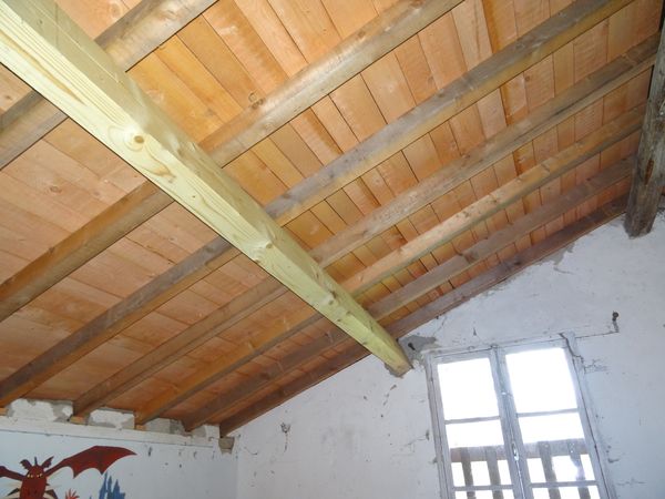 | La toiture du squat et du garage vert est complètement rénovée. Il a été nécessaire de renforcer la panne faitière, de poser un étrier sur le pied de ferme, de changer de nombreux chevrons et voliges. Les rives et la zinguerie sont neuves.