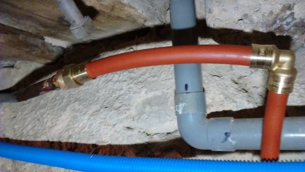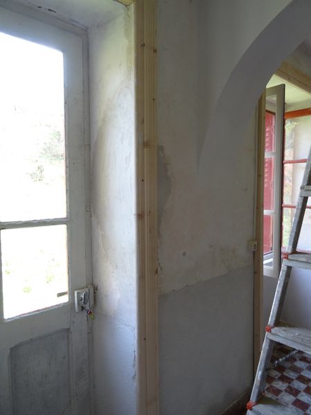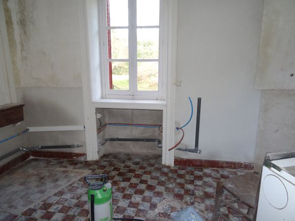 | Une petite fuite dans la cave de la vieille maison a été résorbée. Par le même occasion le lavabo du cagibi de la pièce à mi-étage a été déconnecté. Une petite fuite à la base du robinet de puisage de la cave sera supprimée à la prochaine occasion. La plomberie de la vieille maison été remise en service à l'exception des branchements de la nouvelle cuisine. Des reprises de plâtre ont été faites autour des passages de tuyaux, de la manchette du tuyau de poêle et des boiseries qui sont maintenant fixées définitivement.