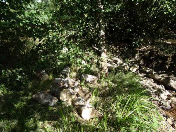 Deux frênes tombés en travers de la Teyssonne ont été débités. Une grosse branche de noisetier aussi. Tous ces bois seront ramassés quand le regain aura été coupé. L'aulne à moitié crevé dans le pré derrière le moulin est devenu dangereux et sera abattu prochainement.