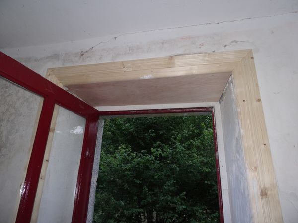 | Des retouches ont été effectuée au plafond de la cuisine de la vieille maison et le linteau de la porte extérieure a été doublé en contreplaqué marine.