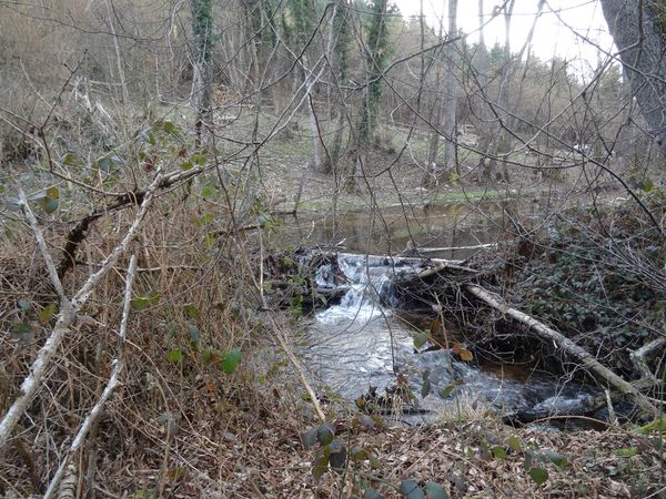 Un barrage clairement anthropique fait de troncs d'arbres a rétabli l'entrée d'eau par la vanne mais l'eau ne vas pas jusqu'au béal et inonde la parcelle en contrebas.