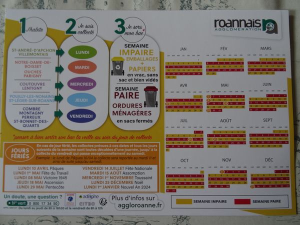 La collecte des ordures ménagères change de modalité avec deux bacs séparés collectés tous les quinze jours selon le calendrier fourni. Les bacs doivent être sortis le jeudi soir sur le bord de la rue du Roc.
