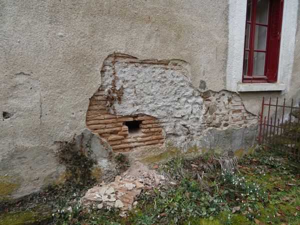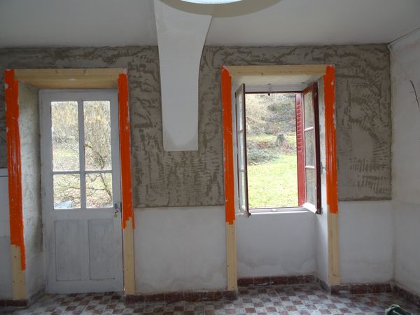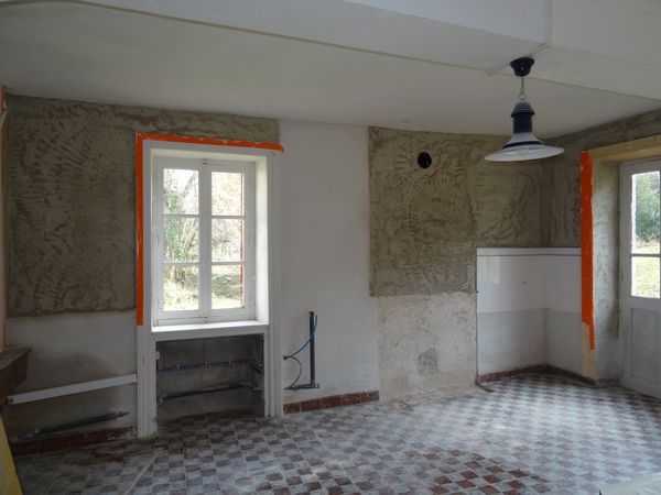 Le dégrossi de l'enduit à la chaux a été réalisé dans la grande cuisine de la vieille maison. L'enduit de finition sera posé ultérieurement. La trappe de ramonage sera finalement scellée à l'extérieur. Le primer destiné à cette cuisine est stocké sous l'escalier de la grande maison.