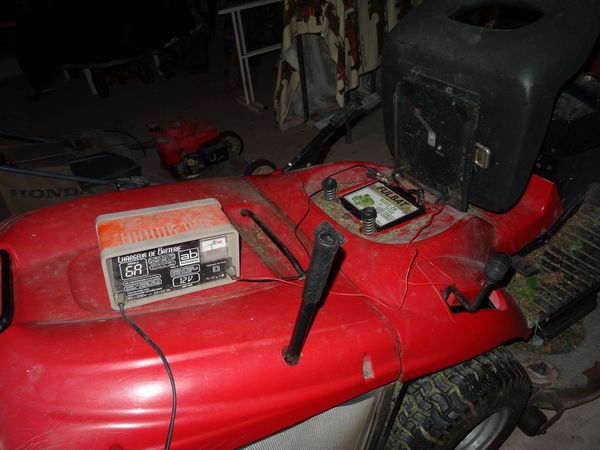 Il semble que le régulateur de la tondeuse ne charge pas la batterie. Les premiers démarrages ont été possibles avec des câbles branchés sur la batterie du VW. L'utilisation prolongée du chargeur a été nécessaire. Il faudra sans doute faire cette manoeuvre préventivement la veille d'une tonte. Le pneu avant gauche de la tondeuse se dégonfle très lentement. La pression de 1.5 Bar peut être rétablie avec la pompe à main. |