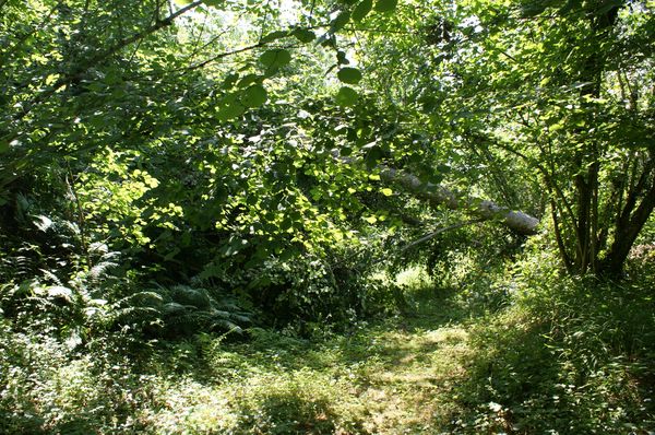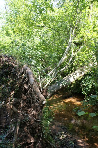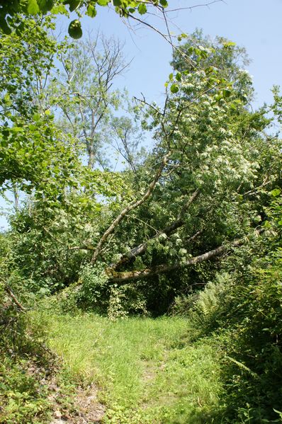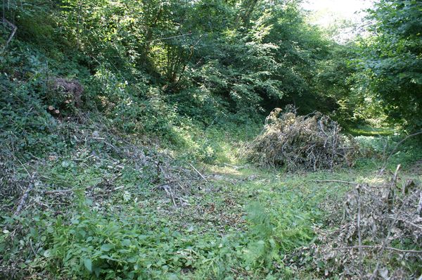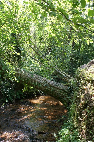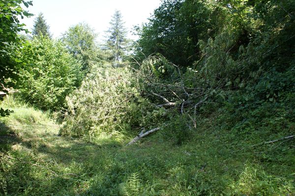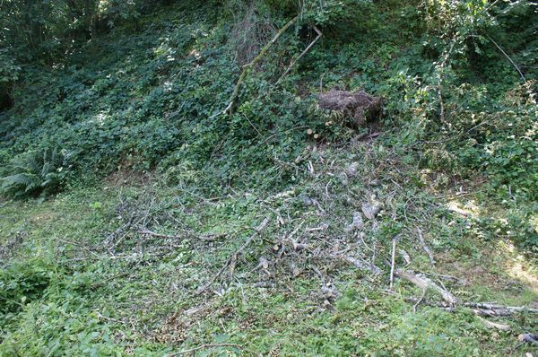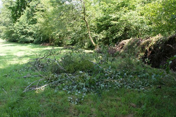 La tête d'un frêne est tombée dans le béal en entrainant un noisetier. Le bois a été débité et les branchages entassés mais les bûches ne sont pas rentrées. |