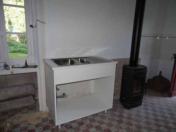 Le raccord de peinture a été fait autour du mur de brique. Le meuble évier a été monté et mis en place. Il a été nécessaire d'entailler la boiserie de la fenêtre pour qu'il rentre. Ce point doit encore être amélioré car la boiserie n'est pas verticale (comme le mur). L'évier a été mis en place mais la robinetterie n'a pas pu être montée faute d'un foret de 10 pour utiliser l'emporte-pièce. Une plaque à carreler de 30 mm a été acquise pour protéger le mur au-dessus de l'évier.