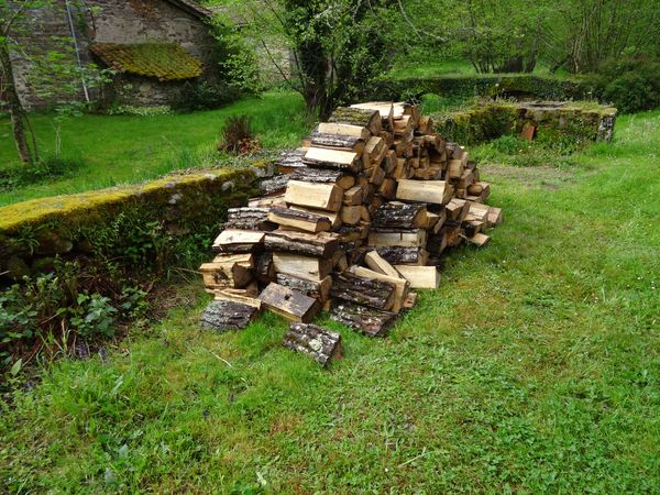 | Une partie du peuplier fendu dans la prairie a été entreposé devant la remise pour sécher. Il reste quelques morceaux à fendre dans la prairie mais les Membré père et fils ont promis de le faire très prochainement.