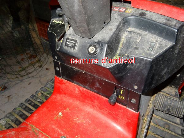 L'écrou qui maintien l'antivol de la tondeuse en place a tendance à se desserrer. Pour éviter de le perdre et d'avoir à démonter le volant et une partie du tableau de bord il est important de le resserrer à la main le plus souvent possible (sens horaire et force modérée). Il ne faut pas utiliser d'outil car toutes ces pièces sont en plastique.