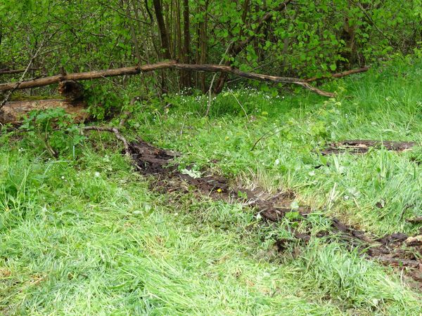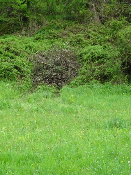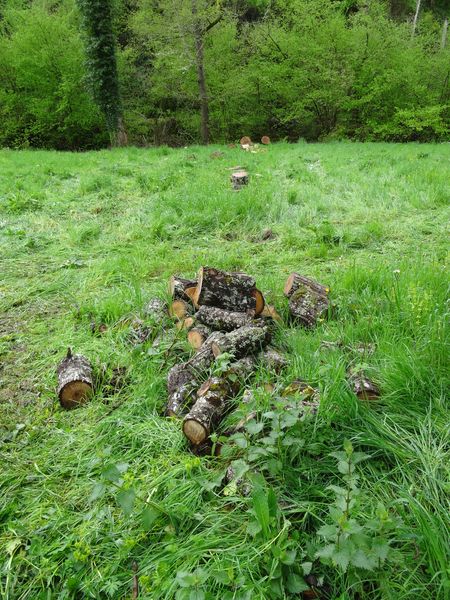 | Les branches de peuplier et de frêne issues du débitage de arbres tombés dans la prairie ont été transportées soit en bordure de prairie soit dans le côteau Nord.