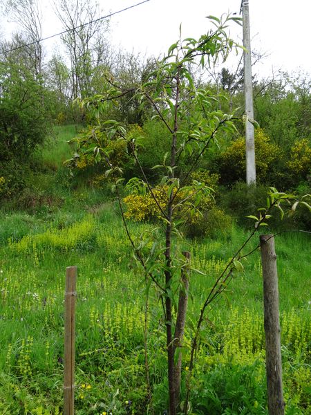 | Les deux petits pêchers ont été traités jus d'ail contre la cloque.