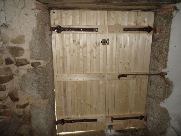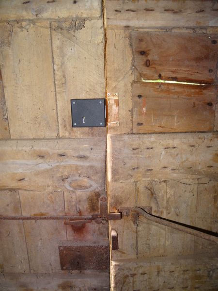 | Le contre penne de la nouvelle serrure de la porte du moulin a été arraché par effraction. Quand ? Il pourrait s'agir d'un évènement lié l'effraction de la remise à matériaux. La serrure ancienne a été réactivée mais il n'est plus possible de faire un duplicata de la clé. La porte de la remise à matériaux a été posée et pourvue d'une nouvelle serrure. Vue la qualité des lattes vendues par bricomarché les deux battants sont voilés et la manoeuvre de la porte demande une certaine énergie. Les anciennes ferrures ont été réemployées