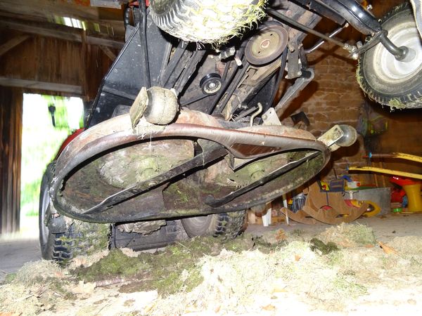 Suite aux blocages répétés des lames par l'herbe humide et grasse, le carter de celle-ci a été dégagé à la truelle. Il y avait de quoi.