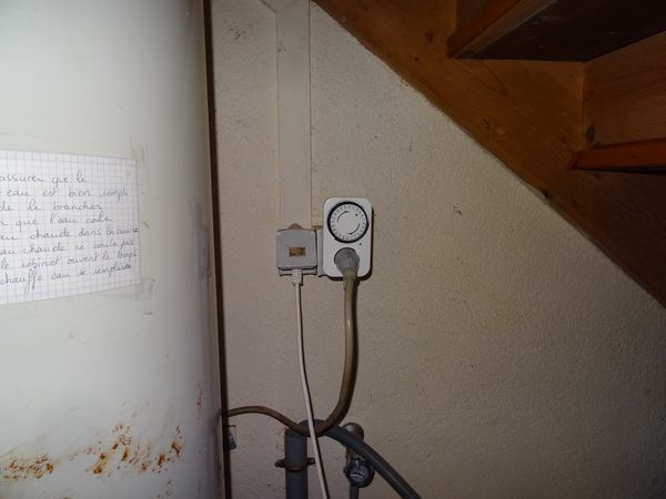 | L'ampoule de la deuxième salle du moulin a été changée. La grande maison étant passée en tarif "tempo" chez EDF, un minuteur a été acheté. Il faut le mettre à l'heure en arrivant. Il est programmé pour mettre le chauffe-eau en fonctionnement entre 22 h et 6 h.