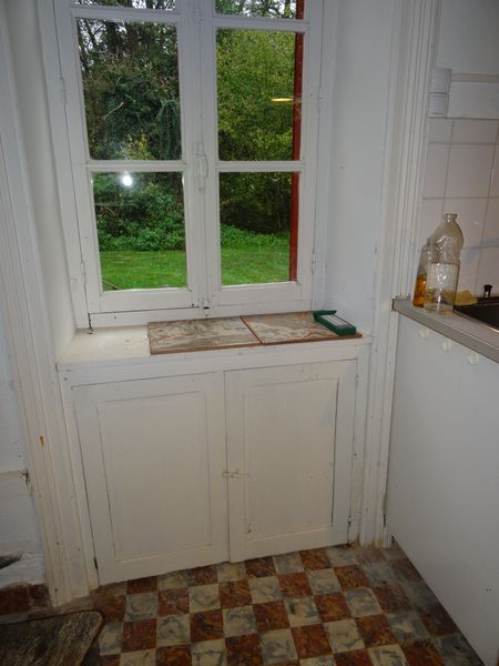 | Les portes du placard sous la fenêtre de la grande cuisine de la vieille maison ont été reposées sans grande fatigue. La réparation de la porte entre l'entrée et la cuisine s'avère impossible. Les vis explosant quand on essaye de les desserrer L'outil magique n'a pas été d'un grand secours.