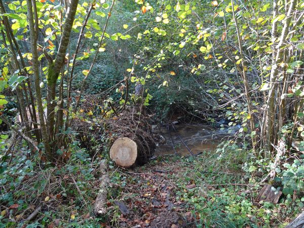 Un frêne mort s'est abattu en travers de la Teyssonnes et sur le troisième prés. Il a été partiellement tronçonné, fendu et rangé. Les arbres tombés à l'été 2023 ont été extraits de leur fâcheuses positions. Les souches ont été redressées par Noël Membré aidé par François Charrondière et Antoine Duverger et leurs tracteurs. La souche tombée sur les barres a été dégagée. |