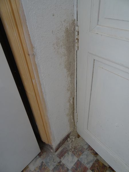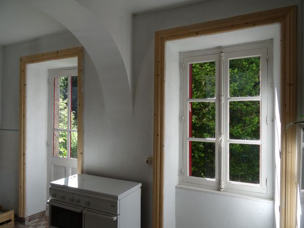 Les boiseries neuves de la cuisine de la vieille maison ont été mastiquées. Le raccord d'enduit à la chaux de la porte de cette cuisine n'a pas tenu.