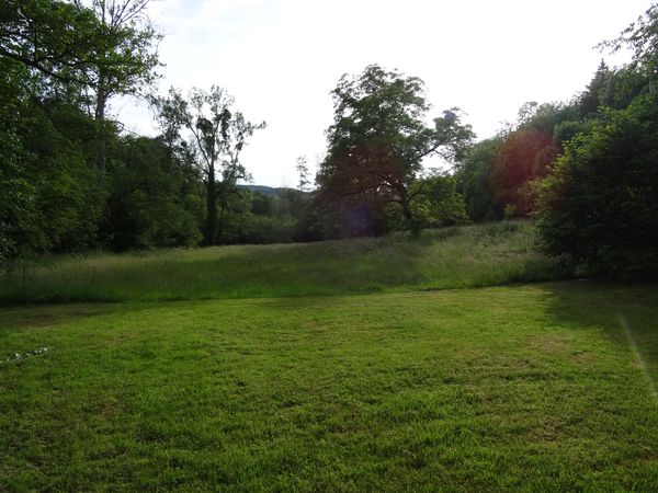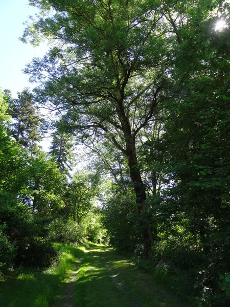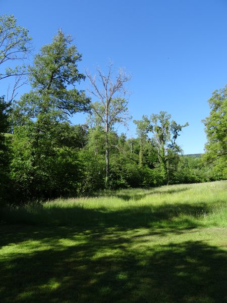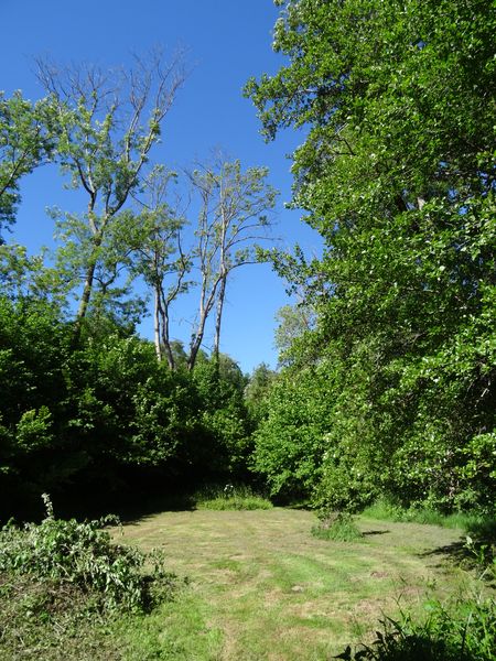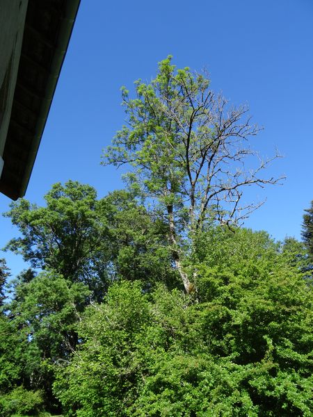 Un des derniers peupliers est mort debout. Beaucoup de frênes sont soit morts soit malades, larguant de grosses branches. L'une d'elle est tombée sur le toit du four. Il va falloir programmer l'intervention d'un élagueur pour le bouquet d'arbres à côté du pont, le frêne près du tas de cendre et un autre près du coin de la grande maison. Ces arbres sont dangereux à court terme. Il est déconseillé de stationner dessous. Le petit frêne près de la cabane sera abattu avant qu'il ne tombe de lui-même car il est complètement mort.