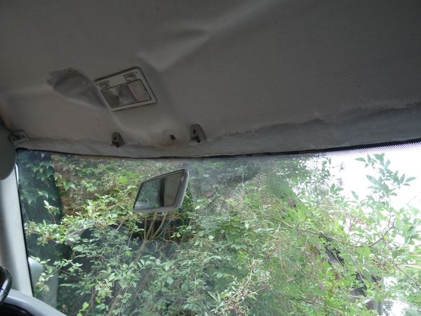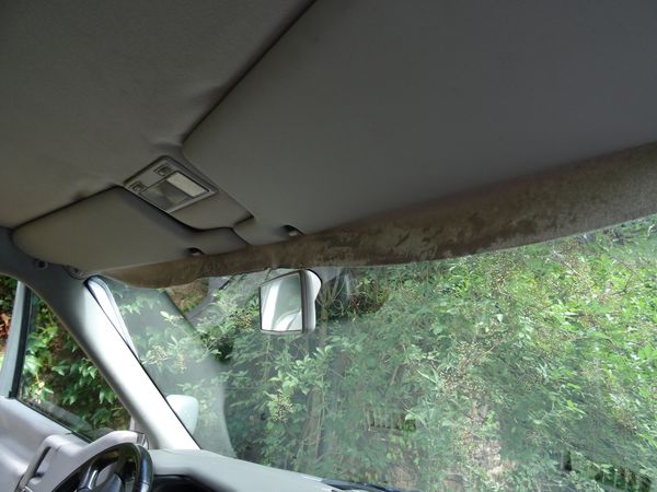 | La toile du ciel de toit décollée par la fuite du pare-brise a été recollée sur son support.