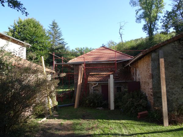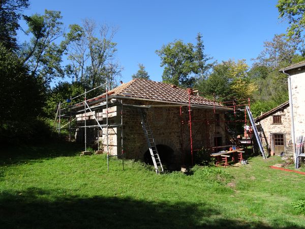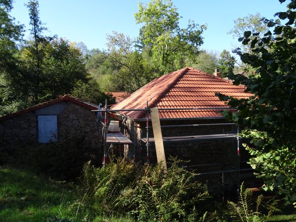 La pose du film pare-pluie, des liteaux, de la zinguerie et des tuiles a permis de mettre le bâtiment hors d'eau avant les grosses pluies. Il manque quelques éléments de faîtières et de tuyaux de descente. Un regard au coin du moulin sera raccordé à celui du coin du fournil.