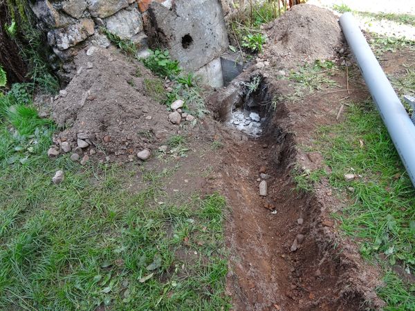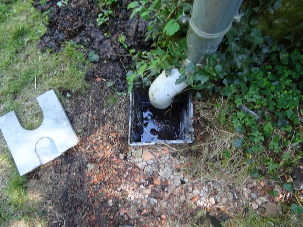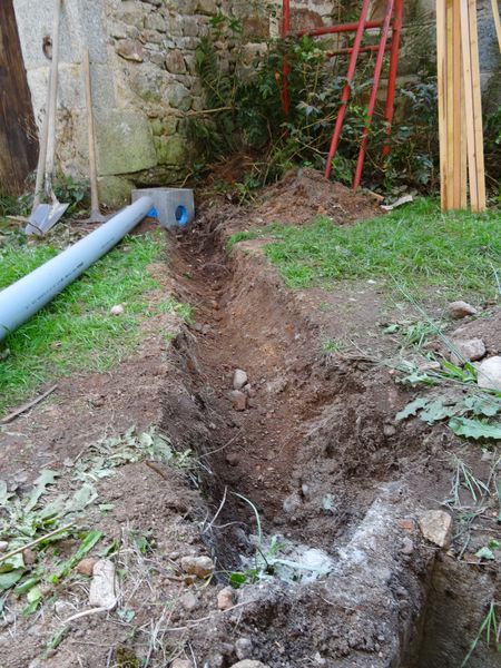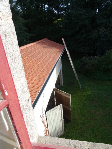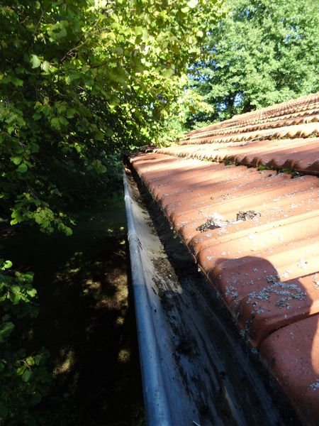 Des traces de débordement ont conduit à déboucher le regard au coin du garage. Un bon volume de feuilles, de sable et de débris de tuiles a été enlevés. Une brosse de 10 cm adaptée sur les tiges de ramonage a permis de déboucher le tuyau d'évacuation dans la rivière mais l'opération devra être renouvelée régulièrement. Le chenaux Nord et Sud de ce bâtiment ont été curés