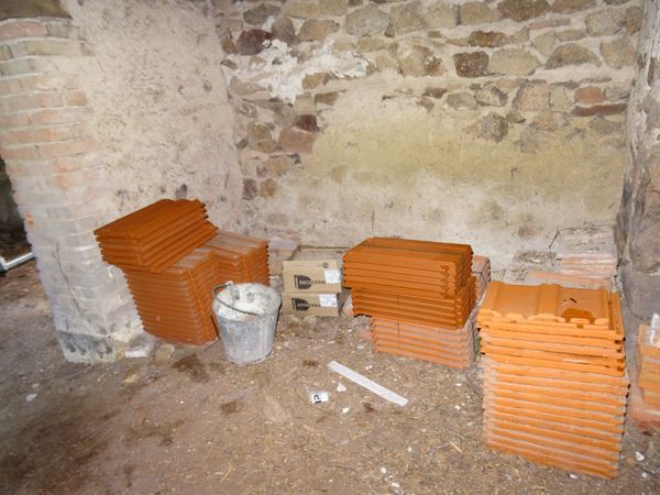 Le rab de tuiles est stocké dans le local à côté du garage vert.