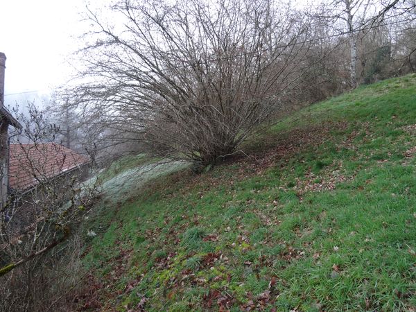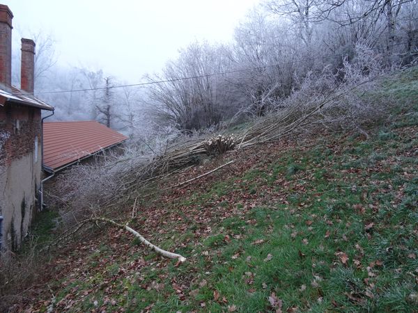 | Le noisetier le plus proche de la grande maison sur le côteau a été recépé. Une partie des branches a été évacuée et