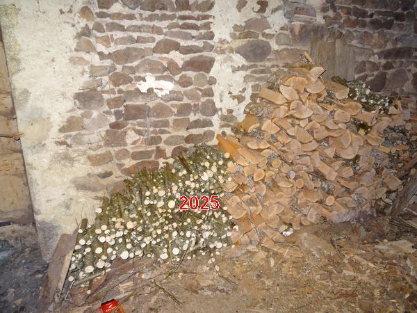 Le bois a été stocké le long du mur Est de la première salle du moulin. Le bois à utiliser en priorité se trouve le long du mur Ouest de cette même salle. |