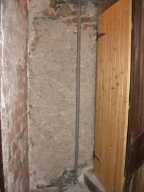 | Montée d'escalier | Le mur à gauche dans la montée d'escalier au grenier a été crépi au printemps et sera peint en blanc. |